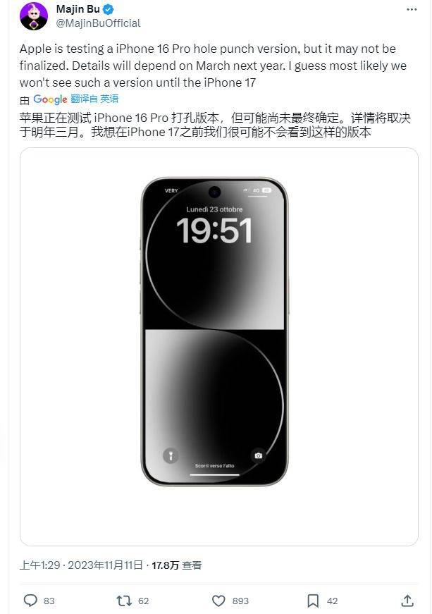 11 月 12 日消息,爆料者 Majin Bu 透露,苹果目前正在测试 iPhone 16 Pro 原型版本中包含一款采用单打孔设计的原型机,而不是 iPhone 14 Pro 和 iPhone 15 系列所采用的“药丸屏”+“灵动岛”,不过这种设计也有可能是在为 2025 年的 iPhone 17 Pro 系列做准备。