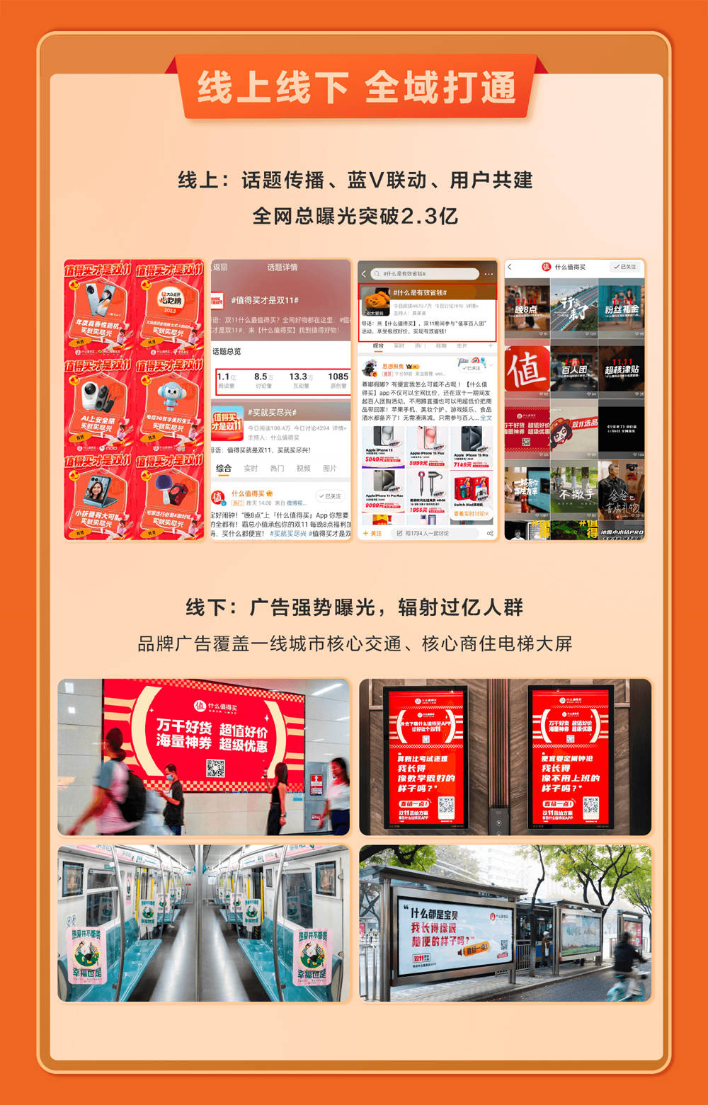 在10月23日至10月31日的第一阶段,为唤醒消费者对于大促的感知,什么值得买第一时间上线双11活动专区,汇聚全网电商的好价格、好商品,并设置一键式入口与标签,方便用户高效决策。为在全域范围内打透“值得买才是双11——买就买尽兴”的主题心智,什么值得买还在地铁、商超等线下核心商圈上线宣传海报,通过线上线下融合的特色整合营销方式吸引了更多消费者。
