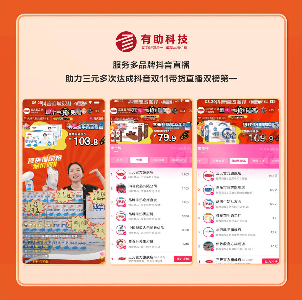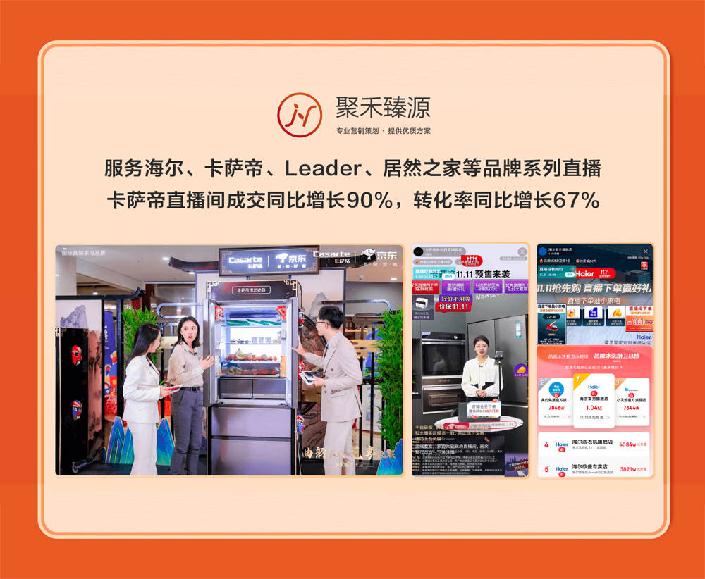全域运营服务商有助科技在双11期间服务多品牌完成抖音直播,并助力三元多次达成抖音双11带货直播双榜第一,实现销量与影响力的双提升。全域互动营销服务商聚禾臻源,双11期间服务海尔、卡萨帝、Leader、居然之家等品牌系列直播,助力卡萨帝直播间成交同比增长90%,转化率同比增长67%。此外,MCN多元通道签约与孵化的多位达人,则将专业消费内容输出全网,助力更多消费者过好双11。