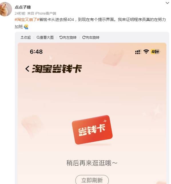 “淘宝又崩了”、“闲鱼崩了”、“阿里云盘崩了”、“钉钉崩了”等词条登上热搜。有网友表示省钱卡从进去报404,到现在有个提示界面。我来证明程序员真的在努力加班。