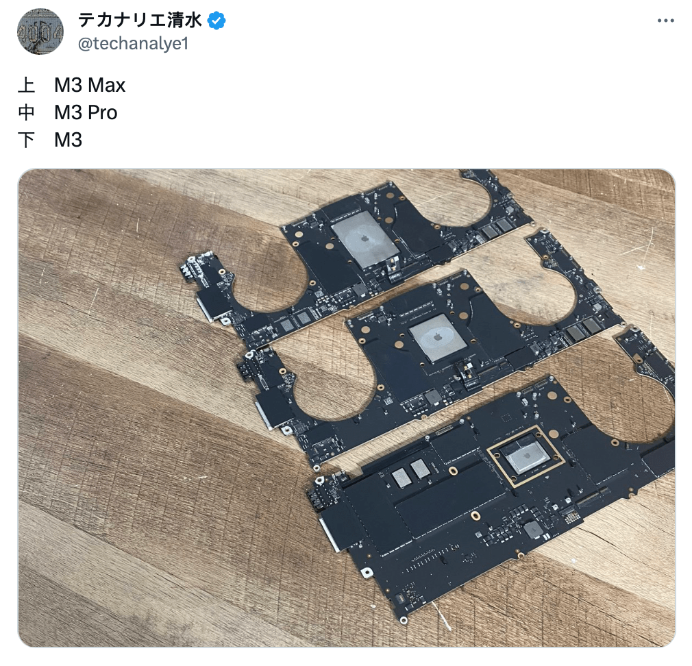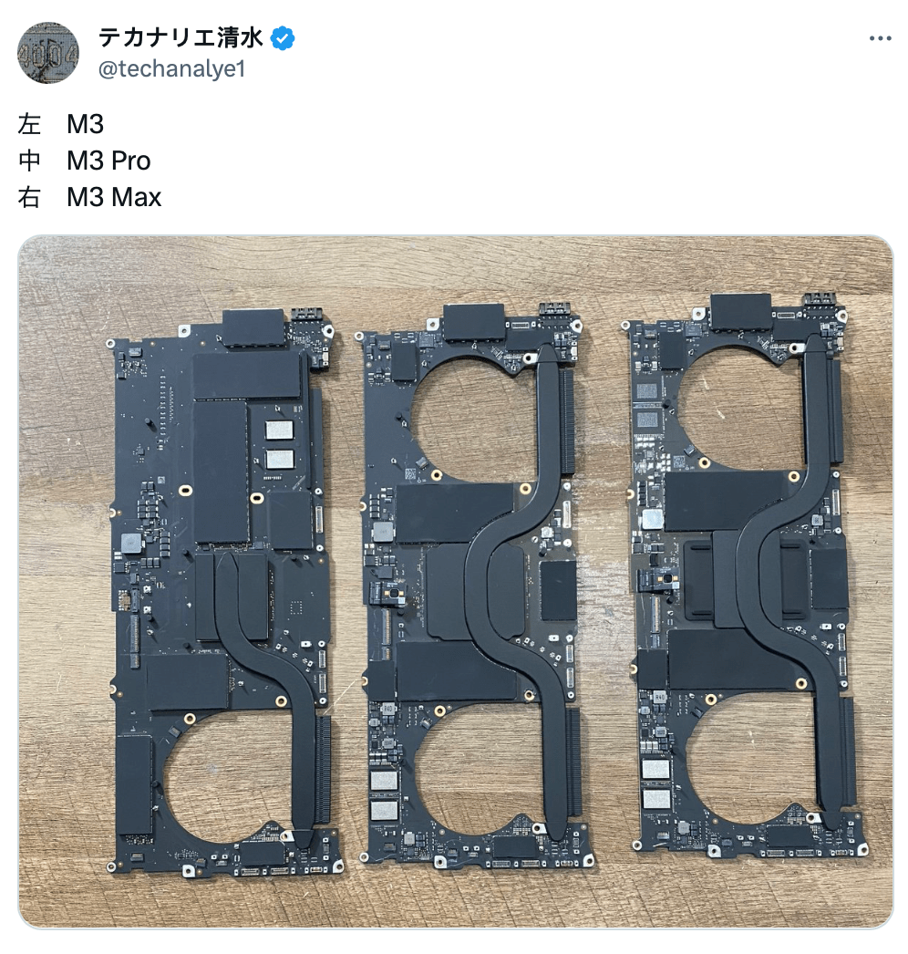 而日前科技博主 techanalye1 在 X 平台公布了 M3 款 14 寸 MacBook Pro 三个版本(M3 / M3 Pro / M3 Max)主板对比照片,实锤了 M3 标准版 MacBook Pro 的确使用了单风扇设计。