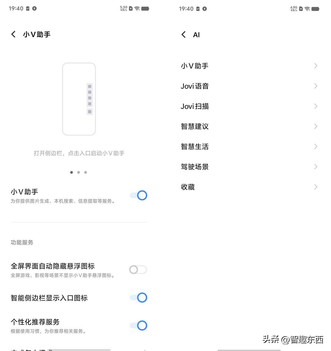 第二个部分就是云端AI功能:蓝心小V(小V助手)。它支持语音、文字、拖拽三种交互,并且其支持文案写作、AI P 图、图像识别、语音识别、机器翻译等。