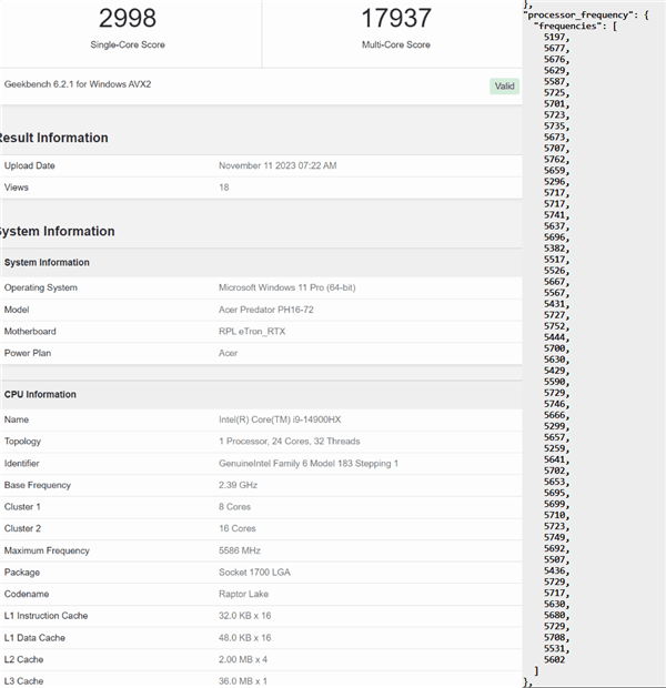现在,GeekBench数据库里第一次出现了i9-14900HX,证实它会有8+16 24核心32线程、36MB三级缓存,实际加速频率最高达到了5763MHz。