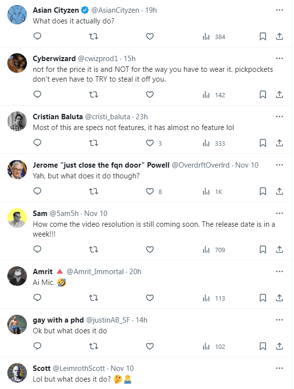 这一演示失败几乎是致命的——一个本就缺乏刚性使用场景的产品,在有限的演示上误导了用户,其产品价值顿时变得无比模糊。果不其然,发布会刚刚结束,AI Pin 就被国外网友广泛吐槽。