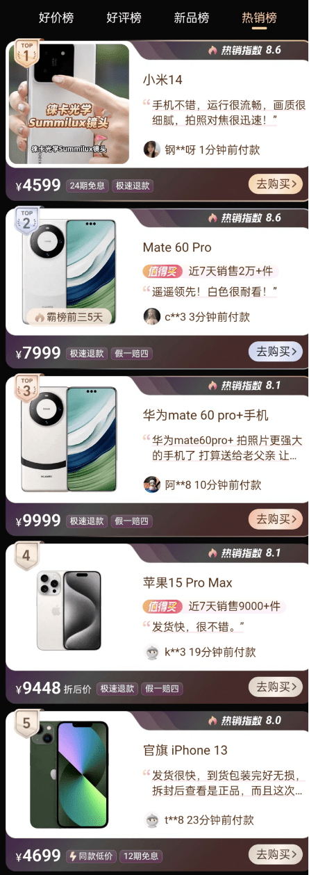 与京东平台类似,小米14和iPhone 15 Pro Max依旧排在榜单前五。二三名分别为在今年强势回归的华为Mate 60系列机型,目前的货量也是较为紧缺。让小编没想到的是,iPhone 13再次出现,并排在第五名。