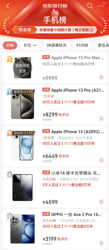 在今年的活动中,京东平台销量最高的就是iPhone 15 Pro Max,根据标注,其销量已经超过了20万件,作为今年苹果配置最高的旗舰产品获得了相当高的关注度。紧随其后的iPhone 15 Pro和iPhone 15也均获得了超过10万的销量。