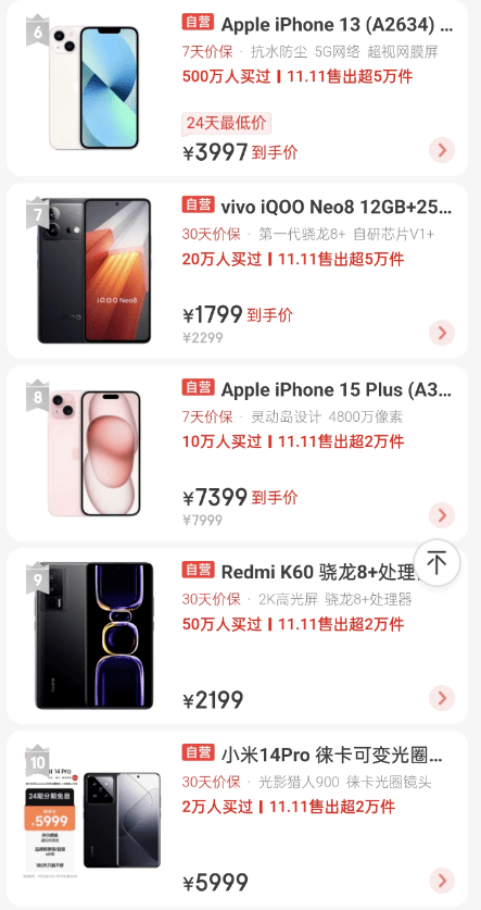 排在第6-10名的分别为iPhone 13、iQOO Neo8、iPhone 15 Plus、Redmi K60以及小米14 Pro。