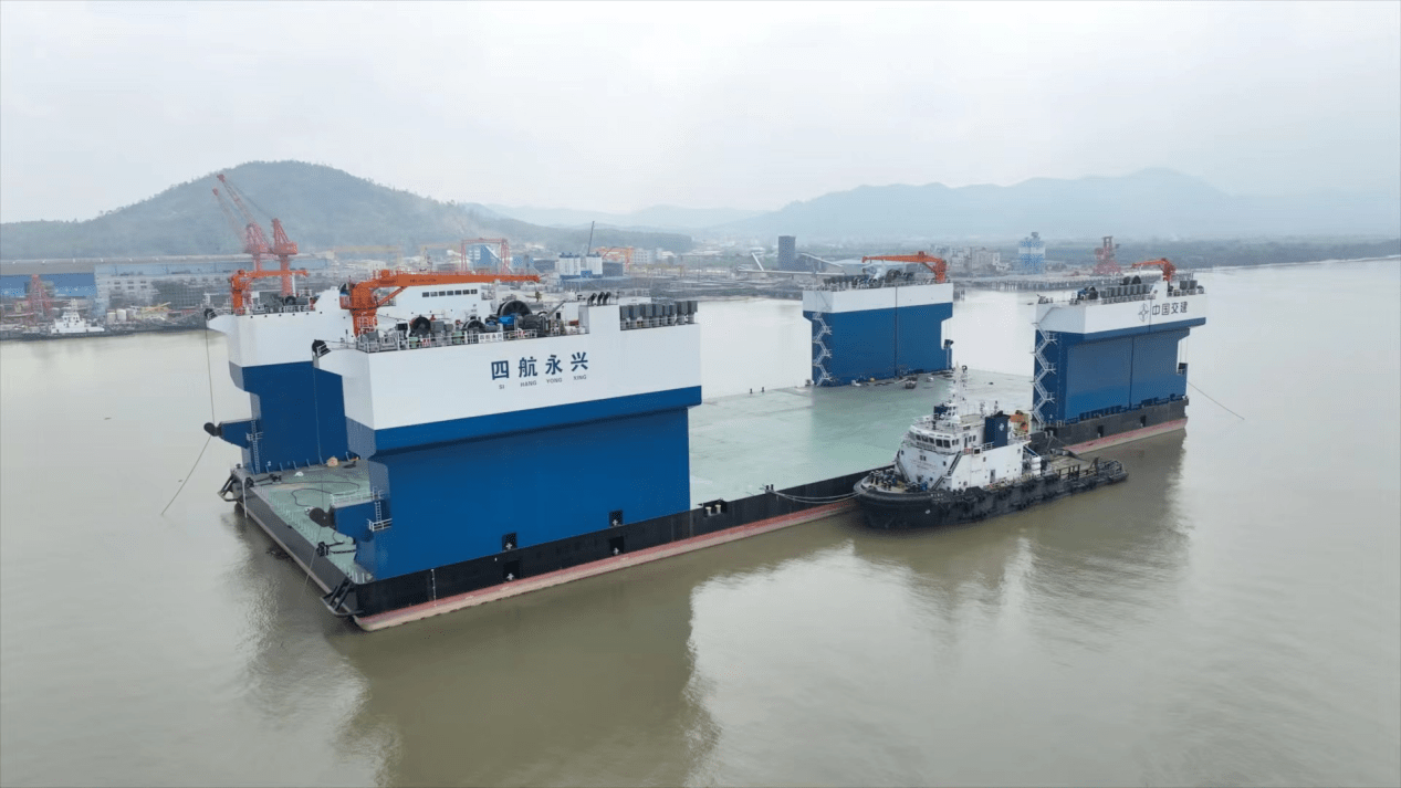 在江门,全球最大的宽扁浅吃水型半潜驳船——“四航永兴”号如钢铁巨兽般停靠在崖门水道上;