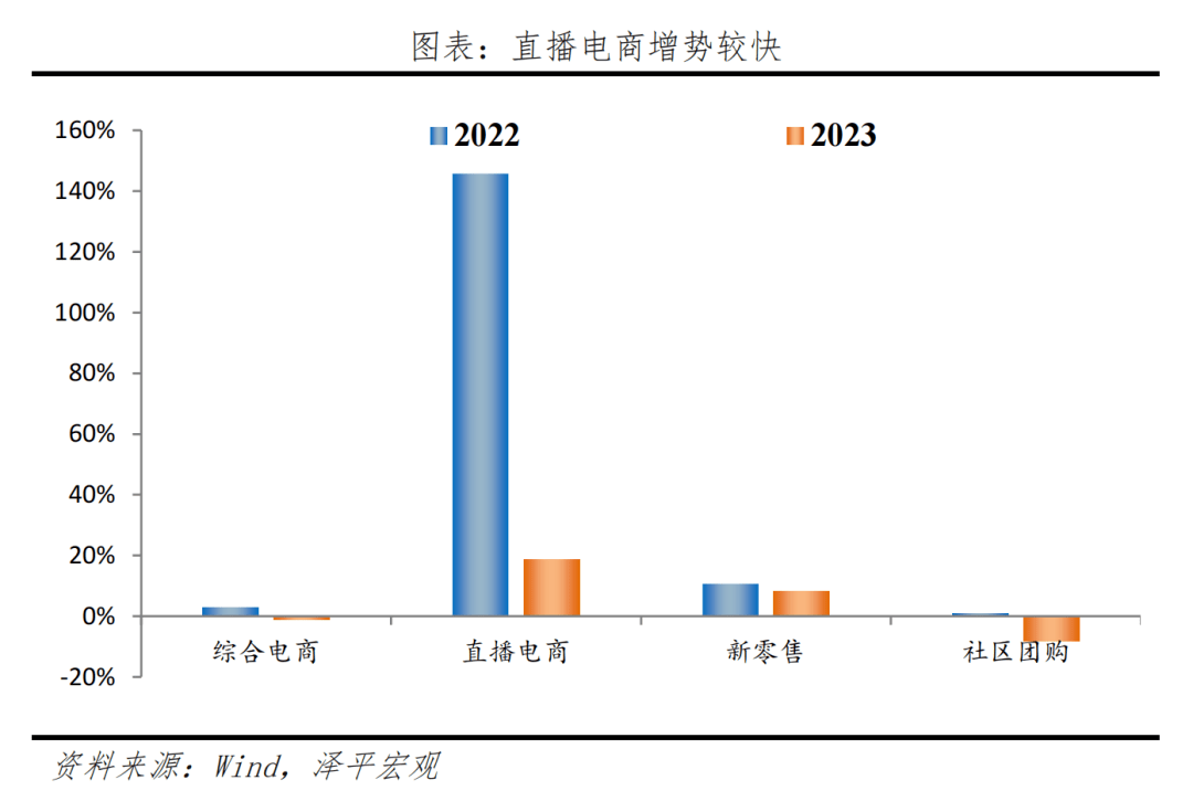 从结构看,直播电商高速发展,传统电商遇瓶颈。2023 年双十一传统电商、直播电商、新零售、社区团购同比变化分别为-1.1%、18.6%、8.3%和-8.1%。其中,传统电商体量仍是最大9235亿,销量前三是天猫、京东、拼多多。直播电商发展迅猛,总体量为2151亿,前三是抖音、快手、点淘。新零售打通线上+线下,双十一销量236亿,前三是美团闪购、京东到家、饿了么。