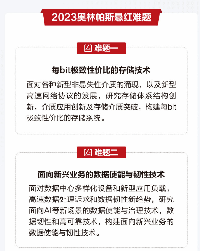 在2023年奥林帕斯奖中,包含了2个奥林帕斯奖,5个奥林帕斯先锋奖,分别是针对个人和团队发布的奖项。华为公布的难题是“每bit极致性价比的存储技术”和“面向新兴业务的数据使能与韧性技术”。
