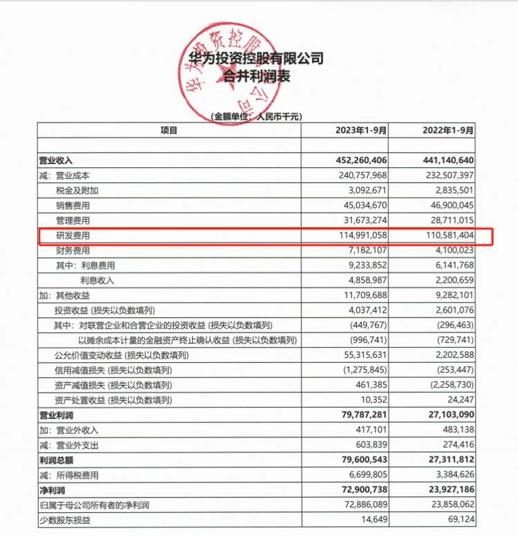 据华为发布的三季报,华为2023年前三季度研发费用达1149.91亿元,同比增加44.1亿元,占前三季度收入的25.4%。