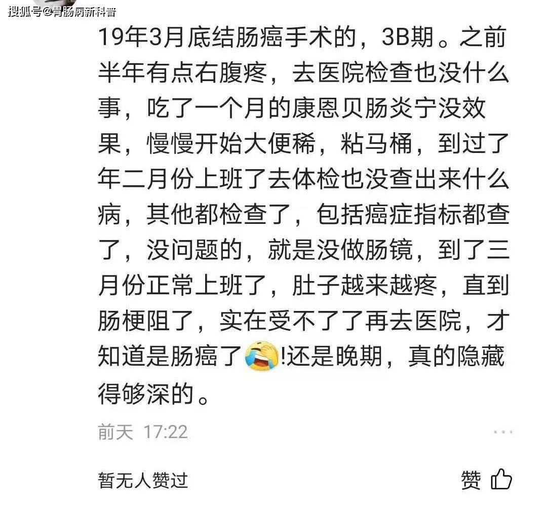 之前半年有点右腹疼,去医院检查也没什么事,吃了一个月的康恩贝肠炎宁没效果,慢慢开始大便稀,粘马桶,到过了年二月份上班了去体检也没查出来什么病,其他都检查了,包括癌症指标都查了,没问题的, 就是没做肠镜,到了三月份正常上班了,肚子越来越疼,直到肠梗阻了,实在受不了了再去医院,才知道是肠癌!
