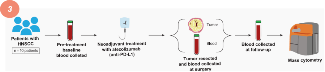 近日,加州大学旧金山分校的Matthew H. Spitzer团队在Cell上发表题为Dynamic CD8+ T cell responses to cancer immunotherapy in human regional lymph nodes are disrupted in metastatic lymph nodes的文章中,研究人员综合运用单细胞技术:single-cell analyses by mass cytometry (CyTOF)、single-cell RNA sequencing and TCR sequencing (sc-RNA+TCR-seq)、sc-RNA and protein sequencing (CITE-Seq)和multiplexed ion beam imaging (MIBI)技术探究了CD8+ T在tdLNs、TME和血液中的对ICB的响应情况及不同部位间的联系。由于晚期头颈部鳞状细胞癌(HNSCC)患者通常接受手术治疗,包括切除区域淋巴结,为探究这些未明了的过程提供了独特的机会。研究中采集了来自HNSCC病人经过常规手术治疗和anti-PD-L1 ICB治疗前后的样本,包括:区域淋巴结(regional lymph nodes, uiLNs)、肿瘤转移区域淋巴结(regional lymph nodes with tumor metastasis, metLNs)、肿瘤组织、血液样本。