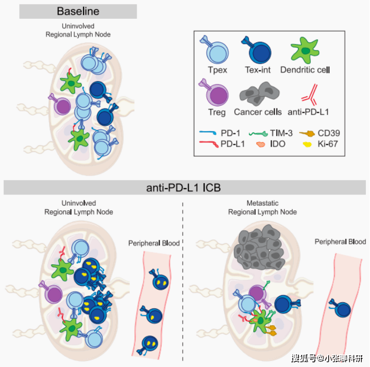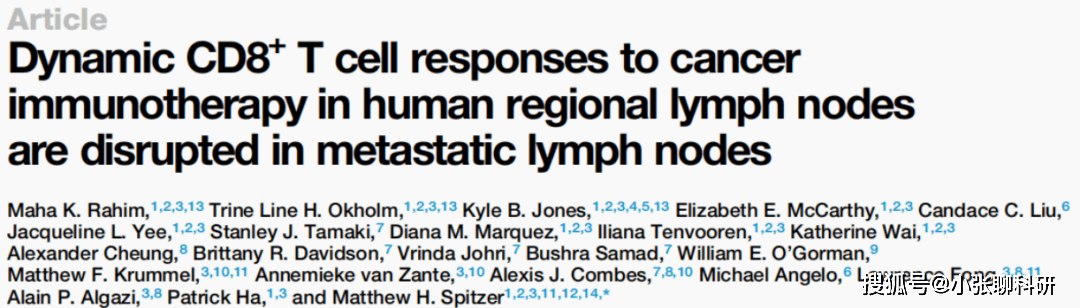 免疫检查点阻断(Immune checkpoint blockade ICB)是通过调节T细胞活性来提高肿瘤免疫反应的治疗方式。CD8+ T细胞是介导ICB疗效的主要效应细胞,由于肿瘤组织样品的易得性,CD8+ T在肿瘤微环境(TME)中得到广泛研究。始祖T细胞从骨髓中迁移至胸腺,在胸腺中成熟后移向次级(外周)淋巴组织(SLOs),包括:淋巴结、脾脏和粘膜相关淋巴组织。在肿瘤发生或者ICB治疗后,T细胞在淋巴组织至肿瘤靶点的响应过程仍然未知。近期研究发现,小鼠模型中次级淋巴器官包括肿瘤引流淋巴结(tumor-draining lymph nodes, tdLNs)中的CD8+ T细胞,是响应ICB不可或缺的一部分。tdLNs是肿瘤抗原首先进入的次级淋巴器官,作为机体免疫监视的枢纽,是决定肿瘤免疫的关键初始部位。由于淋巴结临床样本取样困难,人体内LNs在ICB治疗时驱动CD8+ T细胞的应答过程未有明确研究。