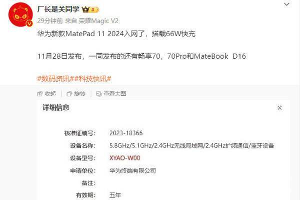 近日,有数码博主爆料称,华为MatePad 11 2024款已经入网,新平板支持66W快充。此外,其还表示,这款新平板会在11月28日正式发布,一同发布的还有畅享70和畅享70 Pro两款新机,以及新款笔记本电脑MateBook D16。