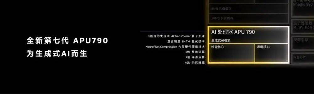 因此,天玑 9300 加入了针对生成式人工智能而设计的第七代人工智能处理器 AP790。针对较为重要的整数运算和浮点运算作出改良,提高了 2 倍的性能、降低了 45% 的功耗。它更内置了硬件级的生成式人工智能引擎,深度适配大模型进行算子加速,处理速度是上一代的 8 倍,1 秒内可让人工智能生成图片。