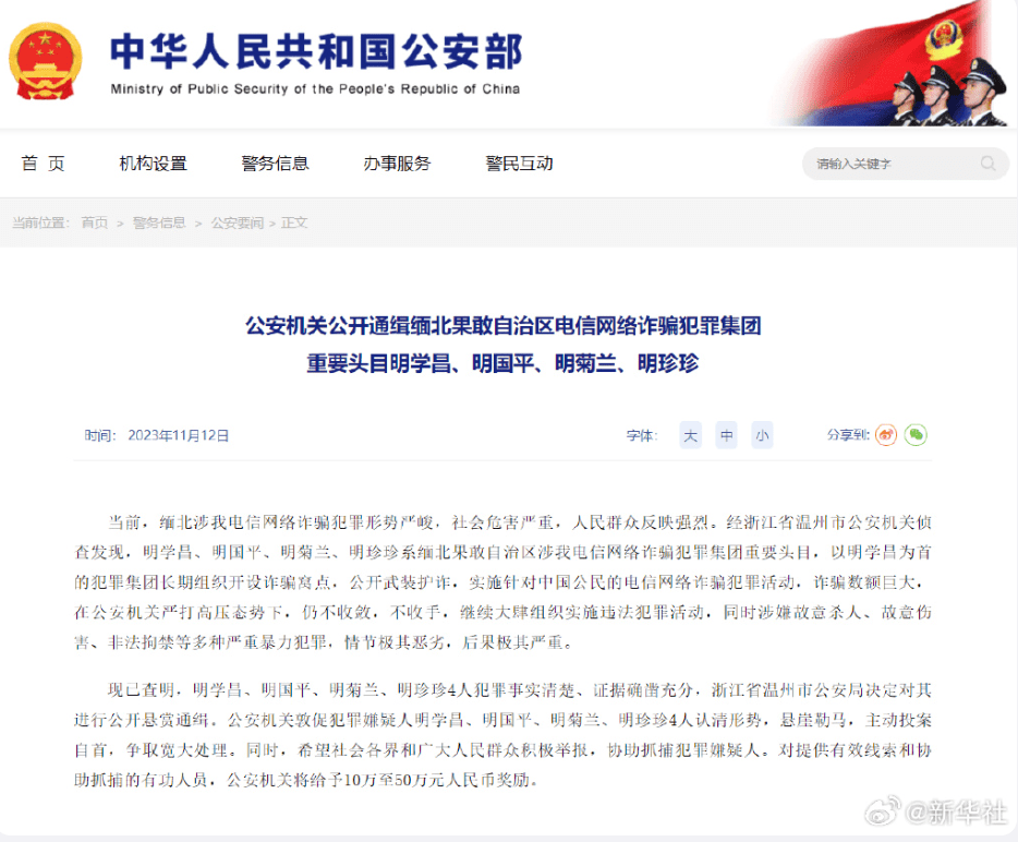 11月12日,公安部刑侦局公众号发布消息,公安机关公开通缉明学昌、明国平、明菊兰、明珍珍4名缅北果敢自治区电信网络诈骗犯罪集团重要头目。