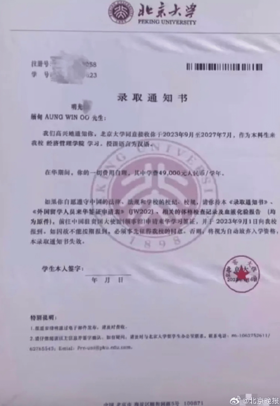 记者从网传“北京大学录取通知书”截图看到:“缅甸明光忠,我们高兴地通知你,北京大学同意接受你于2023年9月至2027年7月,作为本科生来我校经济管理学院学习,授课语言为汉语……”