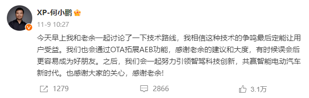 不过,到了11月9日早上,何小鹏突然发文感谢余承东,“今天早上我和老余一起讨论了一下技术路线",“感谢老余的建议和大度,有时候误会后更容易成为好朋友”。这场口水仗也正式落下帷幕。