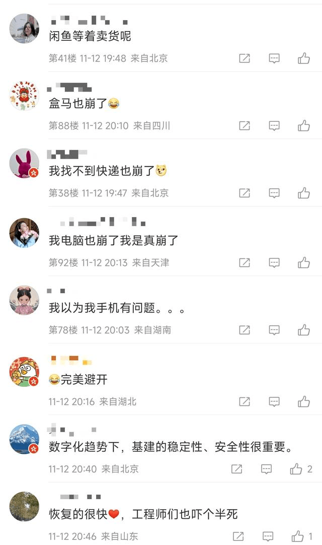 该消息迅速在网上引发热议,不少网友在评论互动中分享经历,例如淘宝购物页面突然空白,登录闲鱼直接显示404界面等。