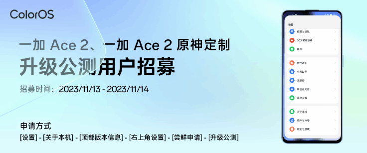 IT之家 11 月 13 日消息,OPPO 今日宣布,一加 Ace 2、一加 Ace 2 原神定制版手机现已开启第二批 ColorOS 14 × 安卓 14 公测用户招募,报名时间为 11 月 13 日到 11 月 14 日。