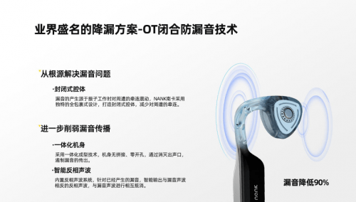 还有一直以来,漏音就是骨传导耳机的诟病,南卡全面升级OT闭合降漏音技术3.0,有效解决外壳震动,并且输出反向声波把外漏音相互抵消掉,进一步减少90%的漏音现象,在骨传导业内可谓遥遥领先。