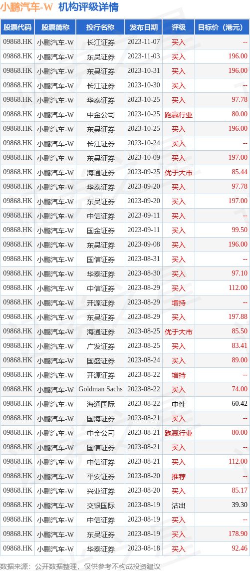 截至2023年11月13日收盘,小鹏汽车-W(09868.HK)报收于60.95港元,上涨0.49%,换手率0.65%,成交量897.55万股,成交额5.42亿港元。投行对该股的评级以买入为主,近90天内共有27家投行给出买入评级,近90天的目标均价为121.03港元。长江证券最新一份研报给予小鹏汽车-W买入评级。
