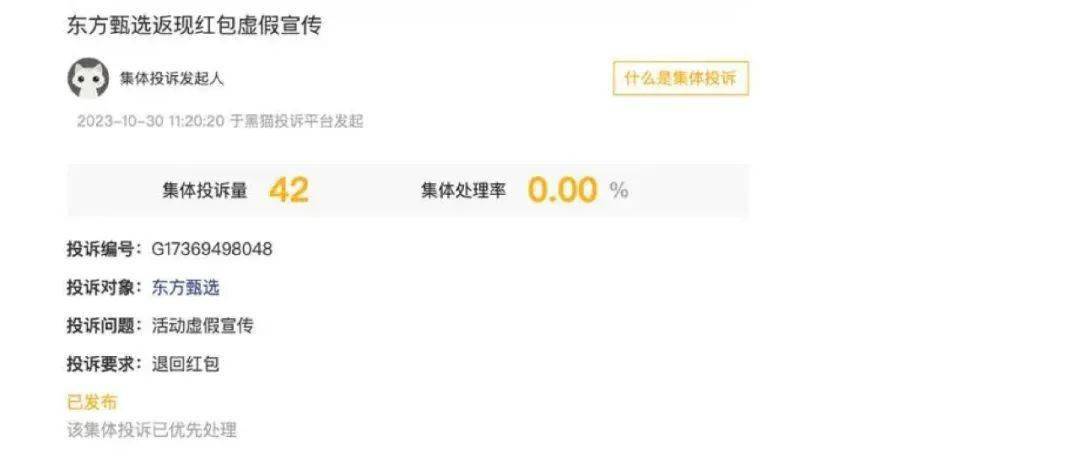 近日,黑猫投诉平台出现了“东方甄选返现红包虚假宣传”的集体诉讼。据悉,用户在东方甄选淘宝直播间下单后,会得到红包,可以用来付尾款、买现货等。不过部分用户发现,付尾款时红包已过期。