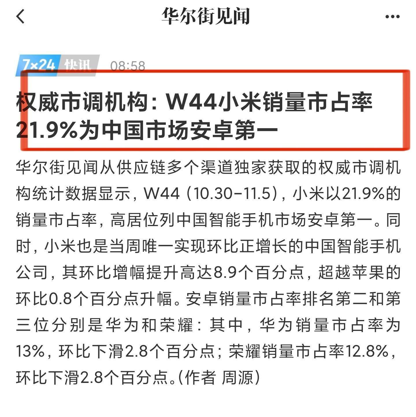 在小米14系列的助力下,小米于W44周在中国智能手机销量上,还以高达21.9%的销量市占率,拿下了市场份额第一,实力非常强劲。此外,小米还是当周唯一实现环比正增长的中国智能手机公司,甚至超过了苹果的环比增幅,为国产争光了。