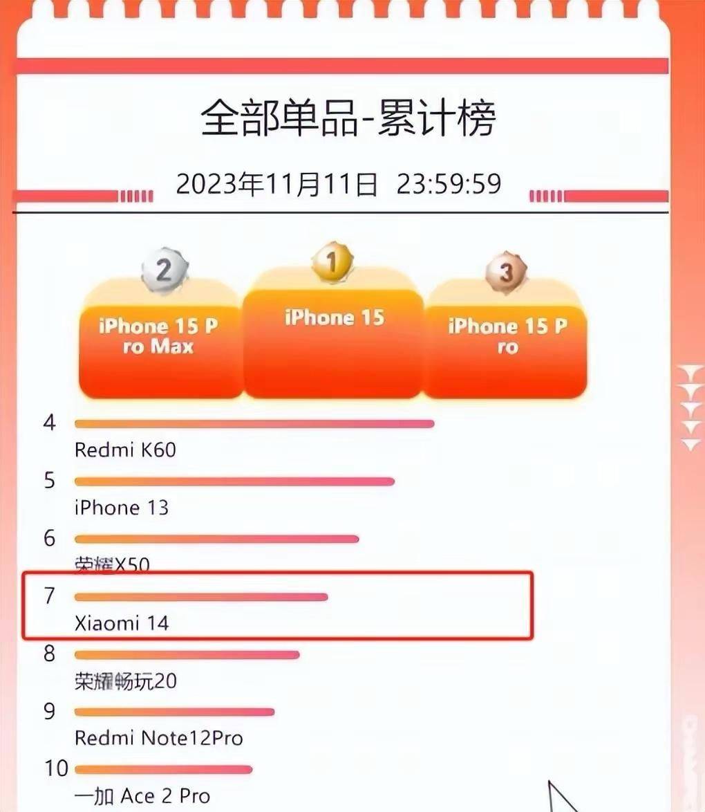 根据权威机构的数据显示,小米14系列上市首销10天,全渠道销量就已经突破了144万台,而且现在还一直处于缺货的状态。从京东双11手机销量的排行榜来看,小米14是唯一上榜的国产高端旗舰机,实力非常出色。不过此次华为Mate60系列没有上榜,也肯定是因为没货,导致销量受到了很大的影响。