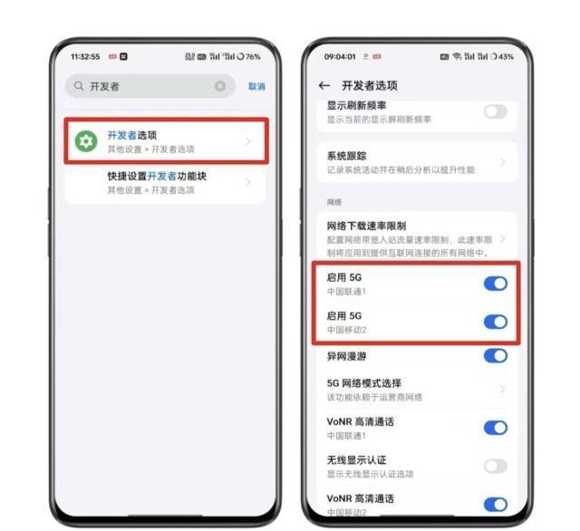 用户可在开发者选项中找到启用5G按钮 图片来源:网络