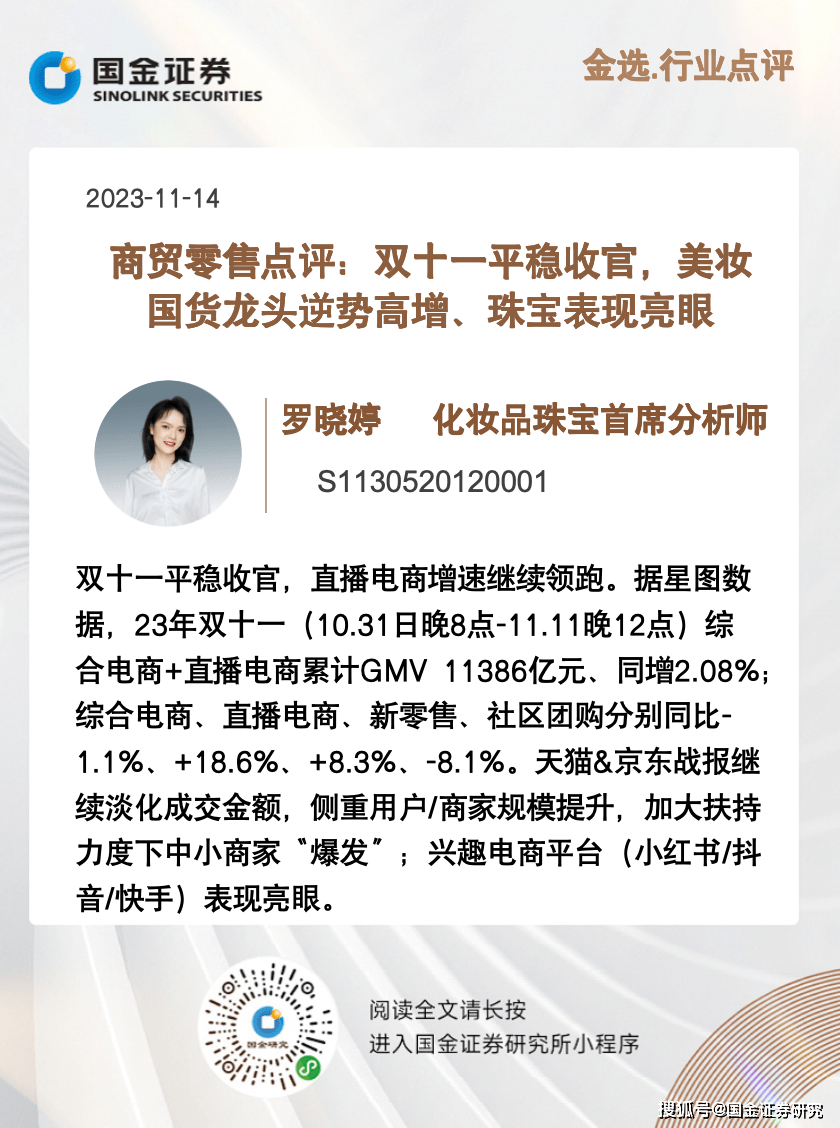 双十一平稳收官,直播电商增速继续领跑。据星图数据,23年双十一(10.31日晚8点-11.11晚12点)综合电商+直播电商累计GMV 11386亿元、同增2.08%;综合电商、直播电商、新零售、社区团购分别同比-1.1%、+18.6%、+8.3%、-8.1%。天猫&京东战报继续淡化成交金额,侧重用户/商家规模提升,加大扶持力度下中小商家“爆发”;兴趣电商平台(小红书/抖音/快手)表现亮眼。