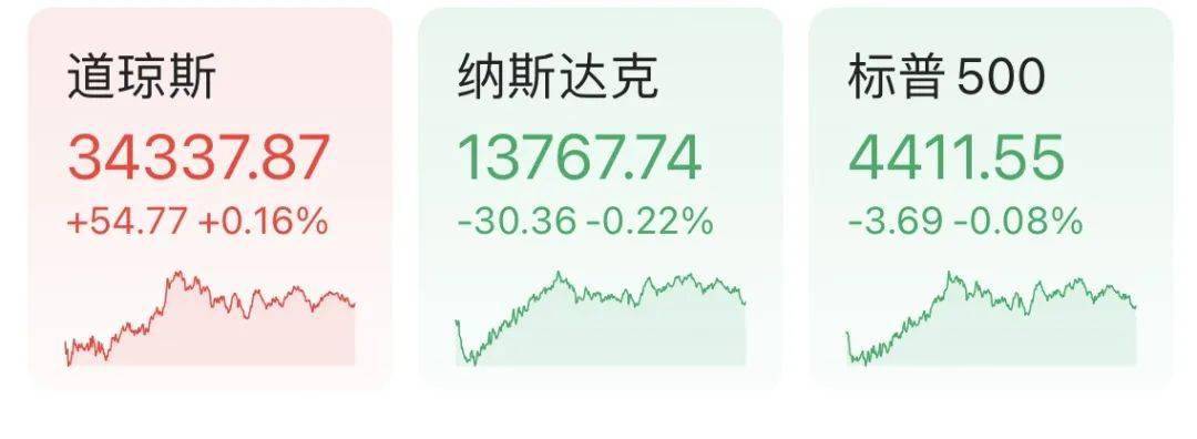 具体来看,美股三大指数低开后走势分化,截至收盘,道指涨54.77点,涨幅为0.16%,报34337.87点;纳指跌30.36点,跌幅为0.22%,报13767.74点;标普500指数跌3.69点,跌幅为0.08%,报4411.55点。