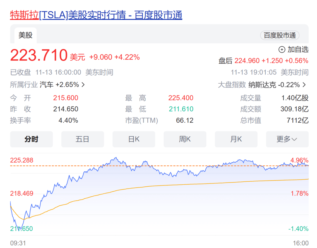 截至11月13日收盘,特斯拉涨4.22%,报223.71美元,市值7112亿美元。股价创10月19日以来收盘新高,市值一夜涨超288亿美元(约合人民币2099亿元)。消息面上,马斯克表示,特斯拉FSD V12自动驾驶约两周内上线试用。