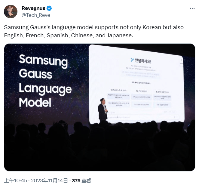 根据博主 @Tech_Reve爆料,三星高斯的语言模型不仅支持韩语,还支持英语、法语、西班牙语、中文和日语。也就是说,国内用户也有望在后续体验到高斯大模型。