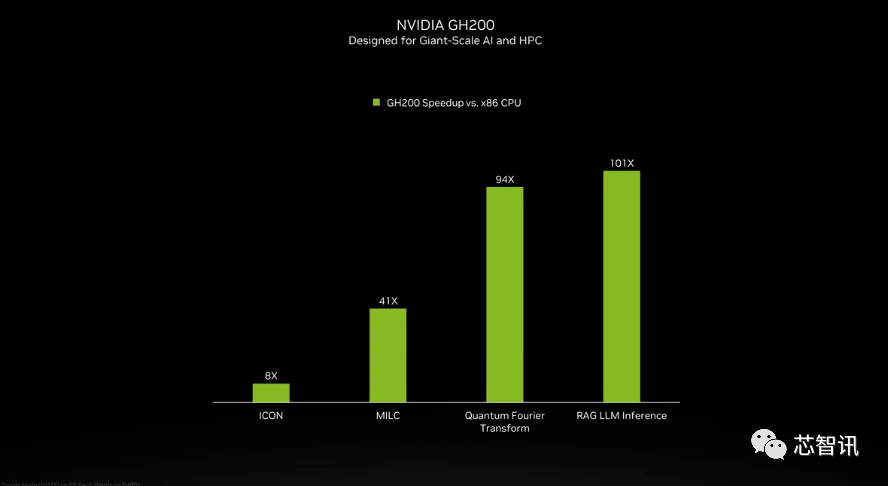 虽然英伟达并未介绍GH200超级芯片当中的Grace CPU细节,但是英伟达提供了GH200 和“现代双路 x86 CPU”之间的一些比较。可以看到,GH200带来了ICON性能8倍的提升,MILC、Quantum Fourier Transform、RAG LLM Inference等更是带来数十倍乃至百倍的提升。