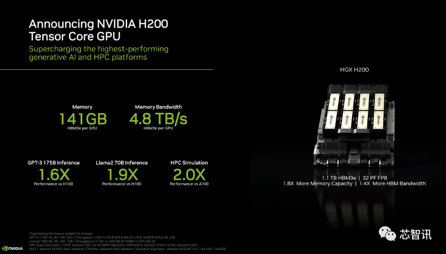 需要指出的是,H200原始计算性能似乎没有太大变化。英伟达展示的唯一体现计算性能的幻灯片是基于使用了 8 个 GPU的HGX 200 配置,总性能为“32 PFLOPS FP8”。而最初的H100提供了3,958 teraflops 的 FP8算力,因此八个这样的 GPU 也提供了大约32 PFLOPS 的 FP8算力。
