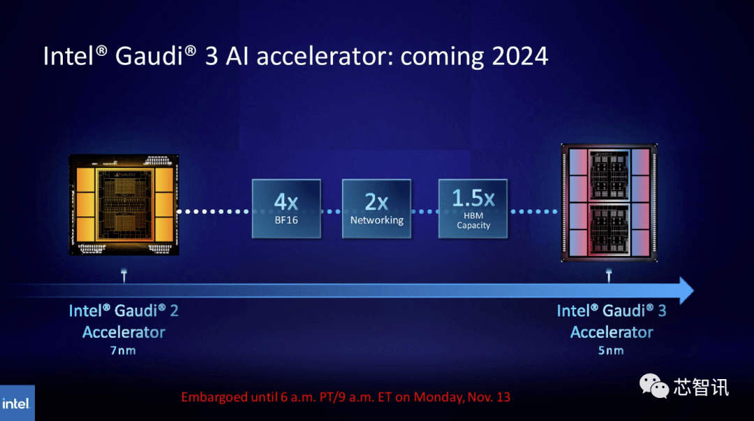 同样,英特尔也计划提升Gaudi AI芯片的HBM容量,最新公布的信息显示,Gaudi 3基于5nm工艺,在BF16工作负载方面的性能将是Gaudi 2的四倍,网络性能也将是其的两倍(Gaudi 2有24个内置的100 GbE RoCE Nic),HBM容量是Gaudi 2的1.5倍(Gaudi 2有96 GB的HBM2E)。正如我们在下图中所看到的,Gaudi 3转向了具有两个计算集群的基于chiplet的设计,而不是英特尔为Gaudi 2使用的单芯片解决方案。
