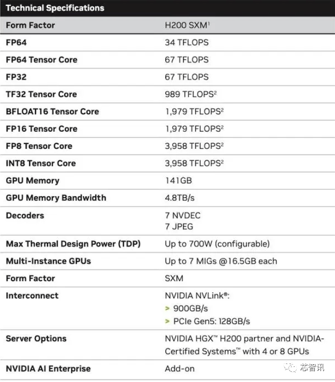 虽然H100 的某些配置确实提供了更多内存,例如 H100 NVL 将两块板配对,并提供总计 188GB 内存(每个 GPU 94GB),但即便是与 H100 SXM 变体相比,新的 H200 SXM 也提供了 76% 以上的内存容量和 43 % 更多带宽。
