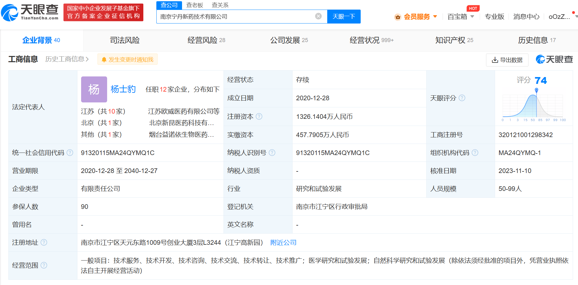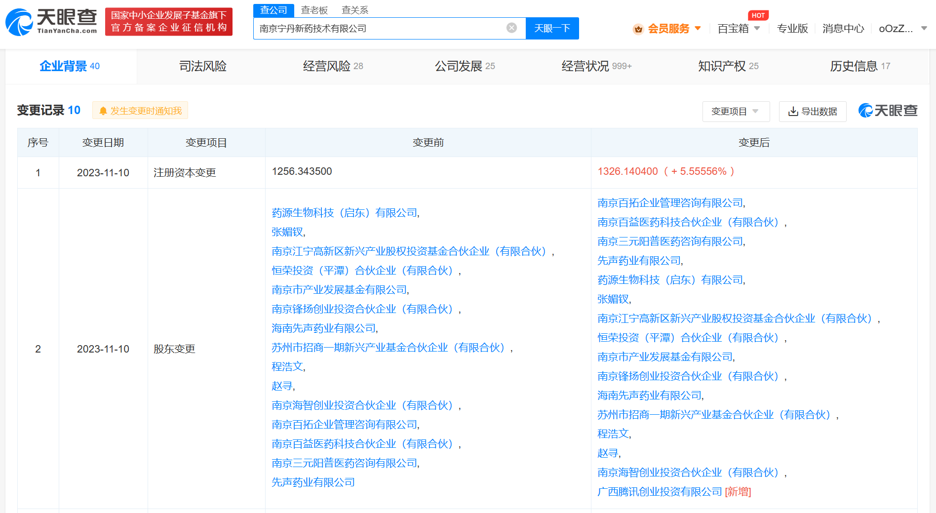 南方财经11月14日电,天眼查App显示,近日,南京宁丹新药技术有限公司发生工商变更,新增广西腾讯创业投资有限公司为股东,同时公司注册资本由约1256.34万人民币增至约1326.14万人民币。南京宁丹新药技术有限公司成立于2020年12月,法定代表人为杨士豹,经营范围含医学研究和试验发展、自然科学研究和试验发展等。据该公司官网介绍,宁丹新药聚焦中枢神经系统疾病新药开发领域。