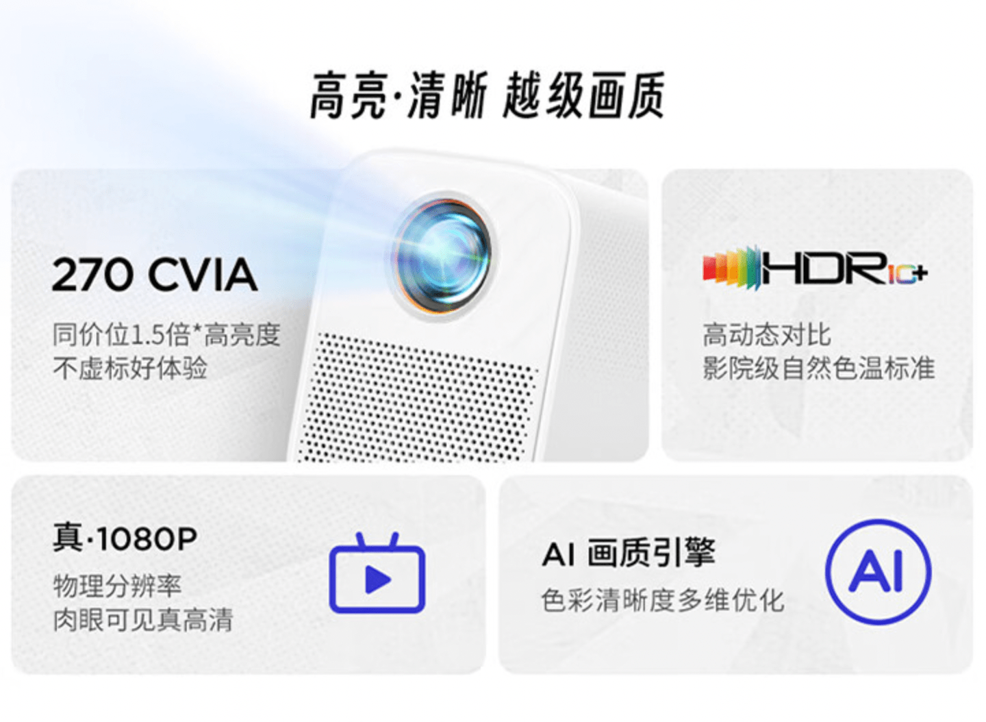 在画质方面,小新 100S 拥有 1080P 全高清分辨率,高端显示设备专属的 HDR10 高动态解码技术让影片明暗有度 、层次更细腻。