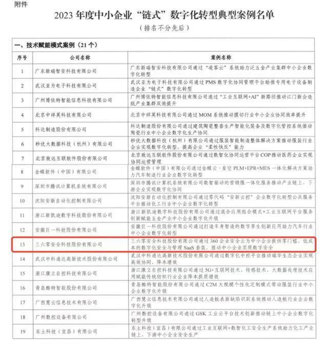 近日,中国工业互联网研究院与国家工业信息安全发展中心联合发布《关于公布2023年度中小企业“链式”数字化转型典型案例的通知》(下称“通知”),通过组织专家评审,最终从191个案例中择优遴选出66个典型案例,其中技术赋能模式案例21个,凭借360安全云为中小企业提供零门槛、低成本的数字安全与SaaS套装,三六零(601360.SH,下称“360”)集团最终入选,获得工信部国家级资质认可。