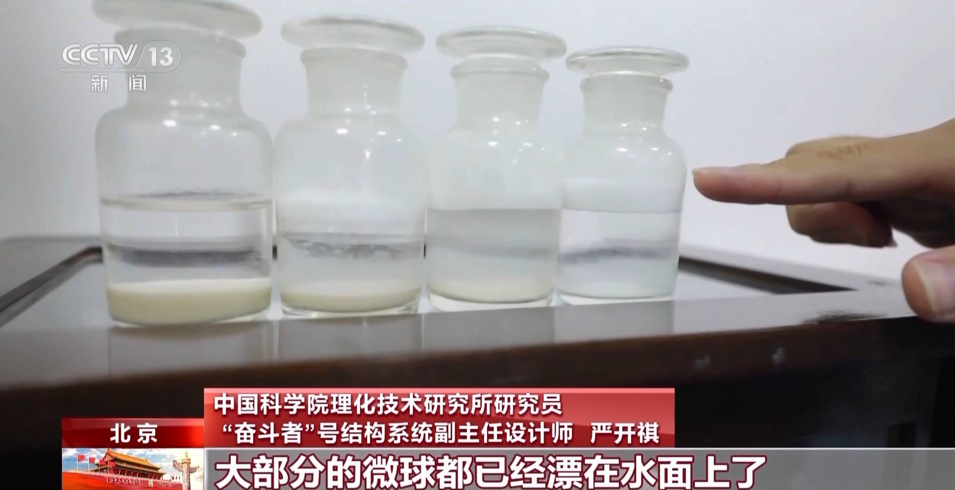 中国科学院理化技术研究所研究员 “奋斗者”号结构系统副主任设计师 严开祺:这个是我们最初做的实验,只有非常少数的是在水的表面,后面我们通过将近十年的努力,到最后我们可以看到大部分的微球都漂在水面上。这个才能形成真正合格的空心玻璃微球。