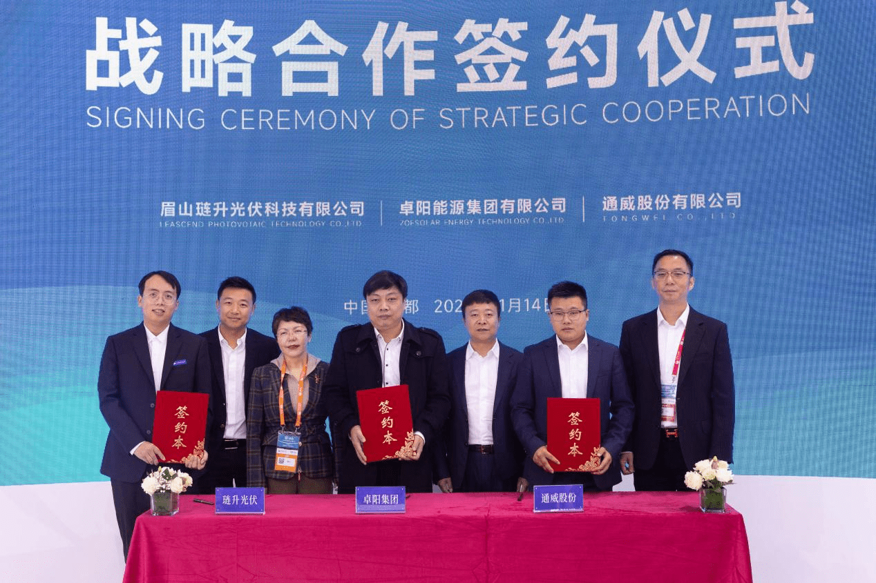 四川省眉山市丹棱县委书记郭红,眉山琏升光伏董事长王新、总经理唐旋,通威股份全球总经理邱新,通威股份营销区域总监郝健,中节能太阳能副总经理黄国平、销售总监曹义敏,卓阳能源董事长黄俊、副总经理腾茂祥,天合光能区域总经理刘强,泉为新能源采购总监沈俊杰,和友重庆光能董事长刁平,建发高科总经理詹胜利,晶合能源副总经理张军,金石总经理杨与胜,四川大学材料学院叶金文院长共同出席签约仪式,参加光伏产业大会的各界领导、广大客商、众多媒体共同见证。