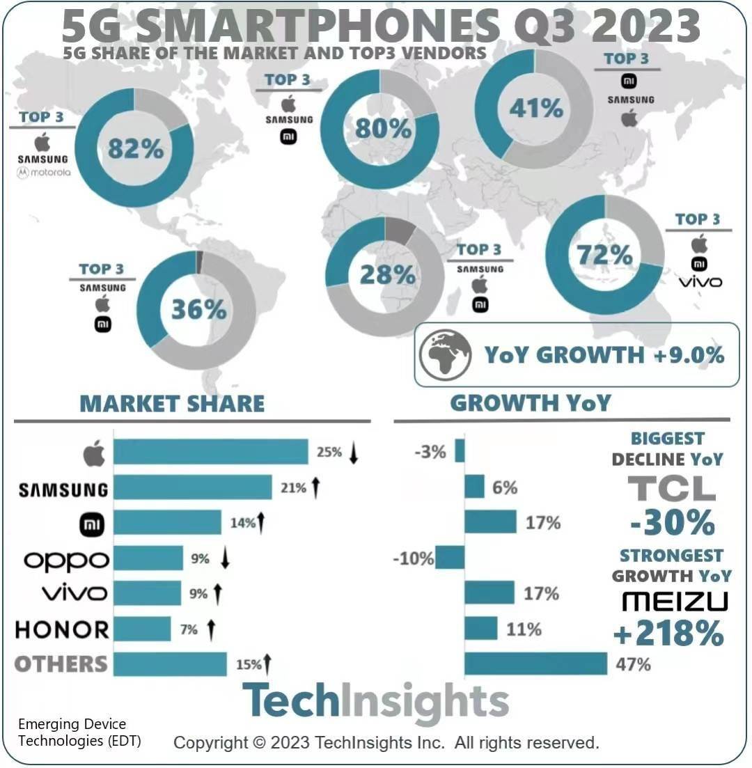 原标题:TechInsights:Q3全球5G智能手机出货量同比连续第五个季度出现个位数变化