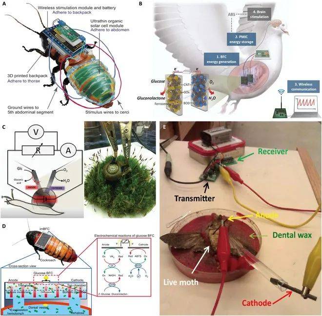 生物燃料电池分成微生物燃料电池和酶燃料电池两种,酶生物燃料电池(EBFC)使用酶作为催化剂,在体内氧化葡萄糖,被认为是最适合用来植入生物体内的电池。不过这种电池更适合大一些的动物,比如老鼠、兔子、鸽子等,而不适合用在昆虫身上。利用鸽子体内的葡萄糖和氧气,生物燃料电池的功率在体外为0.12 mW,在体内为0.08 mW。通过使用功率管理集成电路,可以在10分钟内以28.4 mJ的速度收集足够的能量。