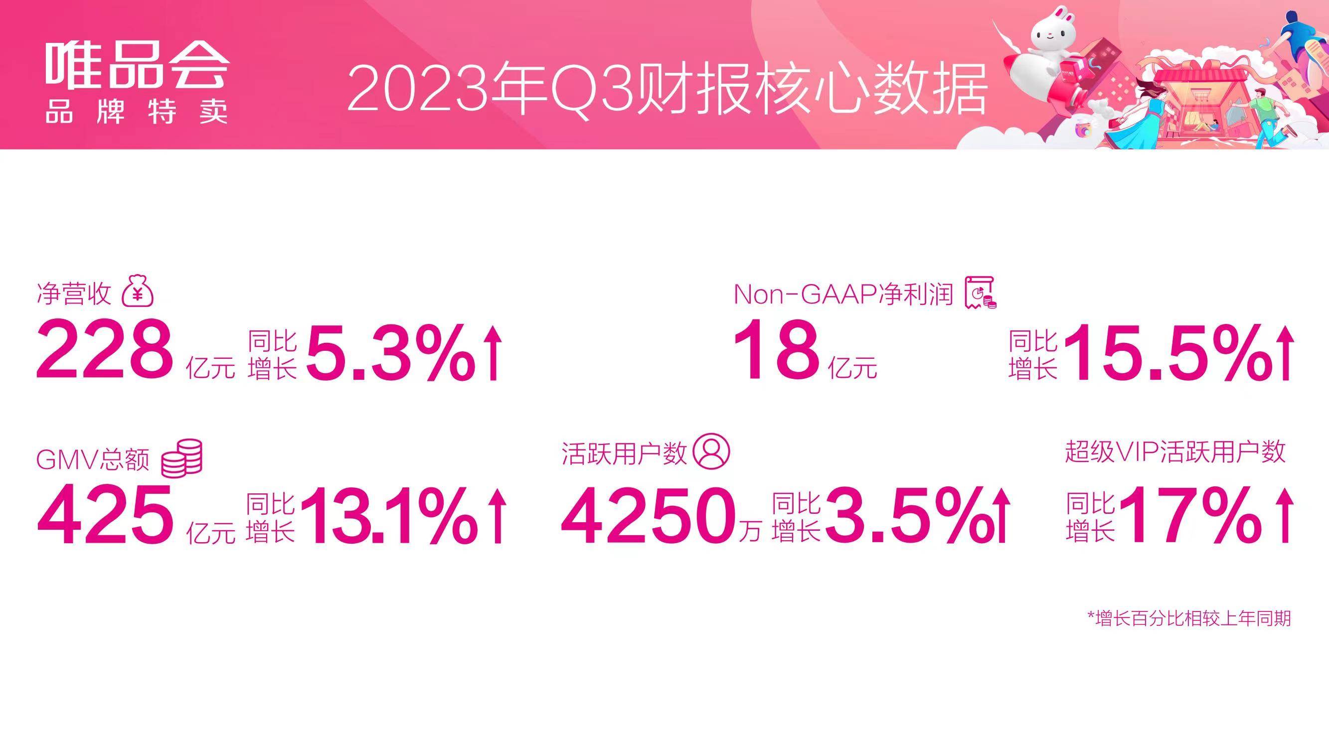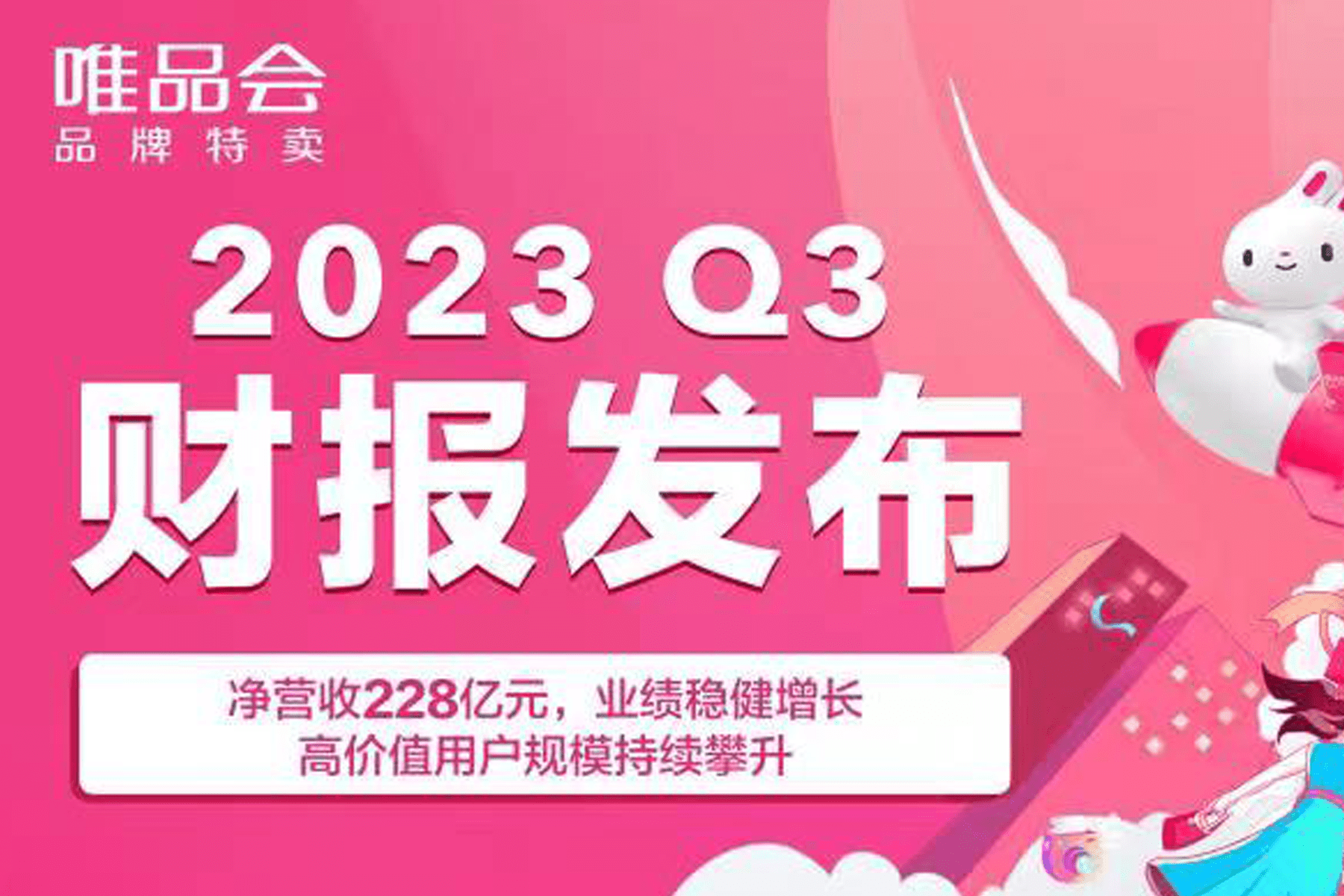 中国领先的在线品牌折扣零售商唯品会发布2023年第三季度财报。财报显示,第三季度,唯品会实现净营收228亿元(人民币,下同),同比增长5.3%;Non-GAAP净利润18亿元,同比增长15.5%。同时,三季度GMV为425亿元,同比增长13.1%;活跃用户数4250万,同比增长3.5%;订单数1.799亿,同比增长6.9%。