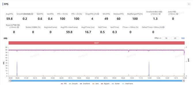 这颗芯片应对一些比较大众的游戏,比如王者、吃鸡是没啥问题的。这里我们用《王者荣耀》进行实测,在60帧+高清画质下,vivo Y100的平均帧率59.8帧,全程几乎满帧运行,帧数曲线接近一条直线,帧数没有出现明显的波动。