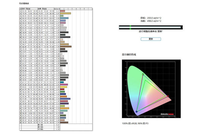 经过手动实测,这块屏幕手动最大亮度为498尼特,全局激发亮度约 1000nit ,局部峰值亮度达1300nit,覆盖了100%的sRGB色域、98%的DCI-P3色域,△E≤1.5。