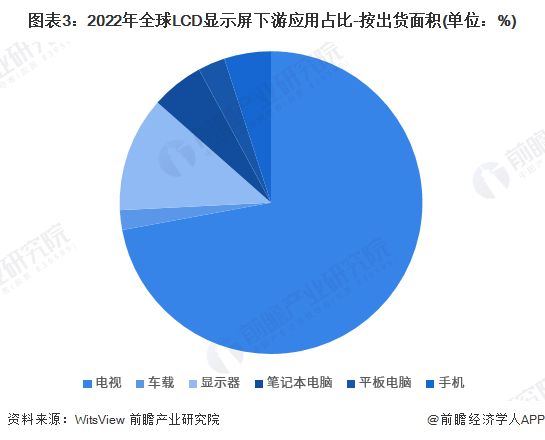 从应用占比情况来看,按出货面积划分,2022年全球LCD显示屏下游应用占比最多的是电视,占比72%,其次为显示器,占比12.3%。